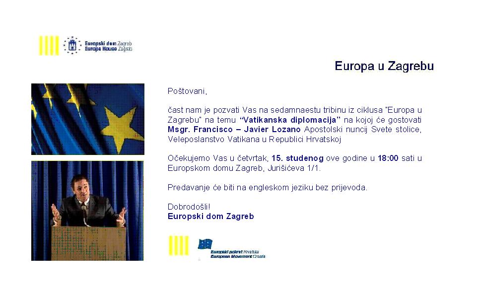 čast nam je pozvati Vas na tribinu iz ciklusa “Europa u Zagrebu” na temu “Vatinanska diplomacija” na kojoj će gostovati Mrgr. Francisco – Javier Lozano, Apostolski nuncij Svete stolice, Veleposlanstvo Vatikana u Republici Hrvatskoj.